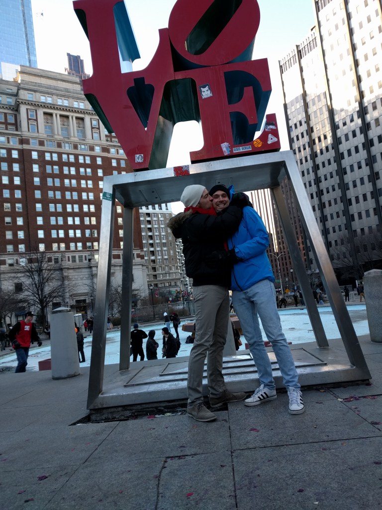 Now this might sound contradictory, but I was (pleasantly) shocked to see that in front of us were 2 guys kissing under the sculpture.   I’ve been hesitant to show affection in the city, as I wasn’t sure- There’s still that fear of the unknown, and I’m looking to the city to show me what is accepted here.  I haven’t seen any same sex anything yet in Philly (maybe I need to get out more?). So in this moment, I’m more captivated by this couple, then the LOVE sculpture itself.  I feel inspired.   I get caught up staring at them (in a  happy supportive way), when a guy pokes us.