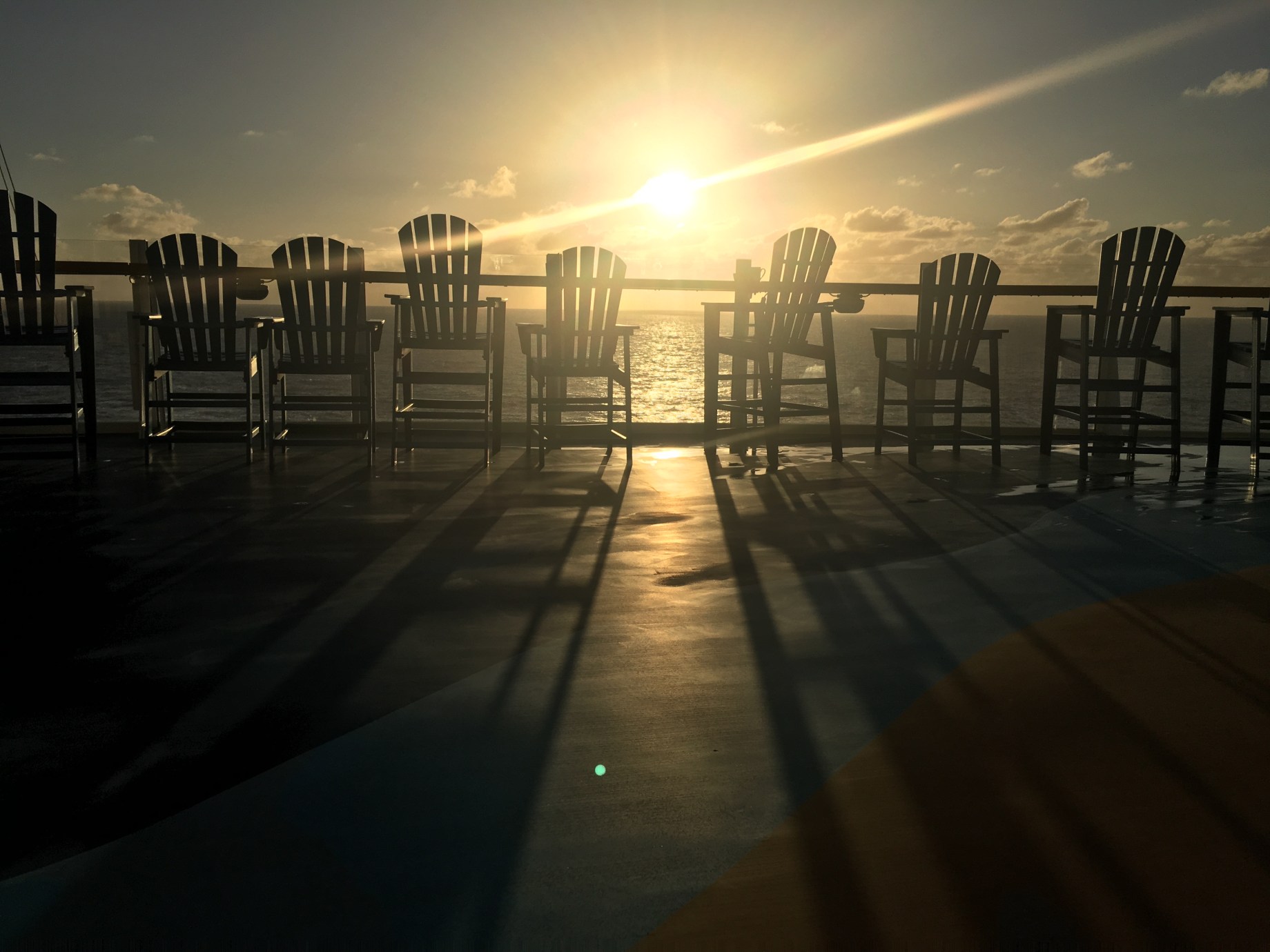 As I step outside of our room, I decide to head to the back of the ship on deck 16. This should be a perfect spot to stare out into the ocean, and hopefully find a bit of inspiration with my blog. I step outside just as the sun is about to peak out over the endless ocean horizon. The clouds look like a scene of out Finding Dory (L to R: some fish, stingray, shark, whale, baby whale). It’s blue, orange, glowing, and stunning. It’s so peaceful and captivating. I put my laptop down, and decide to watch the world happen.