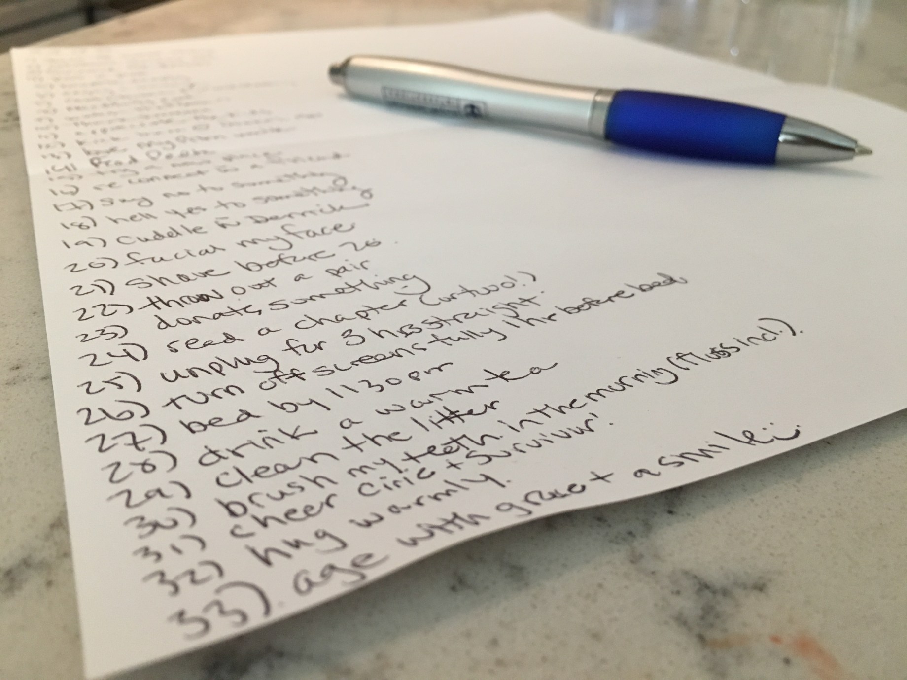 As Derrick left for work, I sat down with my eggs to write my plan for the day.   I found a scrap piece of paper in the recycling, and started writing a list: 33 @ 33.   My rules were simple.  Everything needs to be achievable today.   I need to be intentional.  Every task was an action item, and every task started with a different verb.  I write down whatever comes to mind (as you’ll see, some are silly, some are vague, some are practical).  By not overthinking it, I feel motivated, energized, and focused.  I included things that I am already scheduled to do, or need to do: why make it hard on myself?   I didn’t give space to evaluate worth- everything was worth it today.